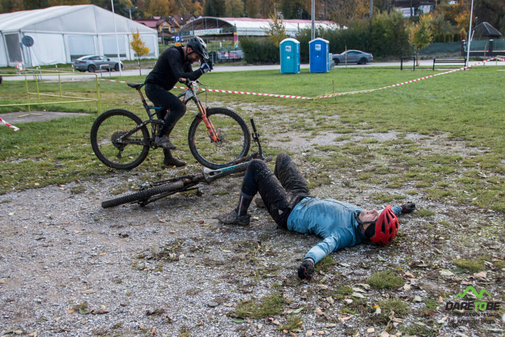 Pierwsze zjazdy i docinki terenowe to była wersja demo tego co czekało na nas na najtrudniejszym, najstromszym i najdłuższym zjeździe całej pętli. Na pierwszej rundzie nie liczyłem, ale przypuszczam, że wyprzedziło mnie z dziesięć osób. Jechałem ten zjazd w tym roku w suchych warunkach i był bardzo wymagający. Biorąc pod uwagę warunki na trasie i już obecny stan ogumienia…to do dziś się zastanawiam jakim cudem objechałem to w pionie. Pocieszałem się, że druga runda będzie łatwiejsza. Faktycznie zjechałem to szybciej i pewniej, ale początek był jeszcze mocniej wyślizgany. Ostra jazda. Na takie warunki przydałyby się jakieś solidne gumy na błoto. Każde inne to sprawdzanie cyrkowych zdolności i duża loteria.
